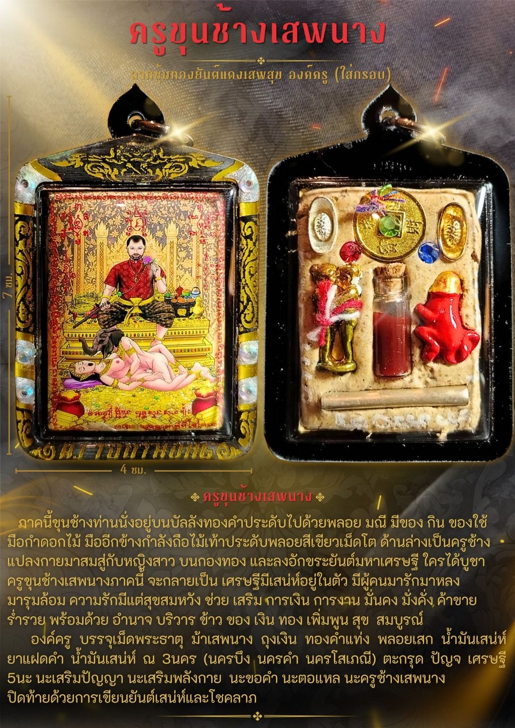ครูขุนช้างเสพนาง ภาคนี้ขุนช้างท่านนั่งอยู่บนบัลลังทองคำประดับไปด้วยพลอย มณี มีของ กิน ของใช้ มือกำดอกไม้ มืออีกข้างกำลังถือไม้เท้าประดับพลอยสีเขียวเม็ดโต ด้านล่างเป็นครูช้างแปลงกายมาสมสู่กับหญิงสาว บนกองทอง และ ลงอักขระยันต์มหาเศรษฐี ใครไดบูชา ครูขุนช้างเสพนาง ภาคนี้ จะ กลายเป็น เศรษฐีมีเสน่ห์อยู่ในตัว มีผู้คนมารักมาหลง มารุมล้อม ความรักมีแต่สุขสมหวัง ช่วย เสริม การเงิน การงาน มั่นคง มั่งคั่ง ค้าขาย ร่ำรวย พร้อมด้วย อำนาจ บริวาร ข้าว ของ เงิน ทอง เพิ่มพูน สุข สมบูรณ์ ด้านหลัง อุดด้วย ผงว่านเสน่ห์ ว่านมงคล เพชรพญาธร เหรียญนำโชค พลอยเสก อิ้นคู่ ก้อนเงิน ก้อนทอง ยาแฝดแดง และ ตะกรุดนะครูช้างเสพนาง ปิดท้ายด้วยการเขียนยันต์เสน่ห์และโชคลาภ อธิษฐานจิตโดย อาจารย์ต้นทอง…