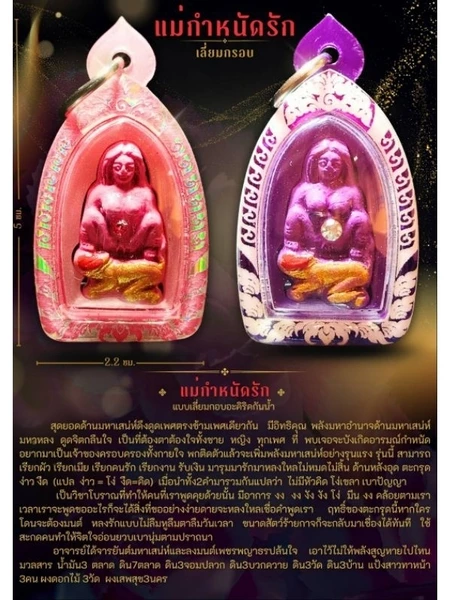 แม่กำหนัด​รัก​ แบบเลี่ยม​กรอบบรรจุน้ำมันขอคำ สุดยอดด้านมหาเสน่ห์ดึงดูดเพศตรงข้ามเพศเดียวกัน มีอิทธิคุณ พลังมหาอำนาจด้านมหาเสน่ห์ มหาหลง ดูดจิตกลืนใจ เป็นที่ต้องตาต้องใจทั้งชาย หญิง ทุกเพศ ที่ พบเจอจะบังเกิดอารมณ์กำหนัด อยากมาเป็นเจ้าของครอบครองทั้งกายใจ พกติดตัวแล้วจะเพิ่มพลังมหาเสน่ห์อย่างรุนแรง รุ่นนี้ สามารถ เรียกผัว เรียกเมีย เรียกคนรัก เรียกงาน รับเงิน มารุมมารักมาหลงใหลไม่หมดไม่สิ้น ด้านหลังอุด ตะกรุด ง่าว งืด (แปล ง่าว​ = โง่​ งืด=คิด​)​ เมื่อนำทั้ง2คำมารวมกันแปลว่า​ ไม่มีหัวคิด​ โง่เขลา​ เบาปัญญา​